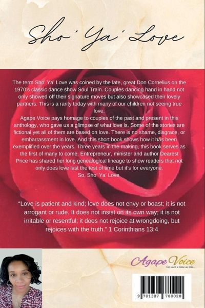 The term Sho' Ya' Love was coined by the late, great Don Cornelius on the 1970's classic dance show Soul Train. Couples dancing hand in hand not only showed off their signature moves but also showcased their lovely partners. This is a rarity today with many of our children not seeing true love. Agape Voice pays homage to couples of the past and present in this anthology, who gave us a glimpse of what love is. Some of the stories are fictional yet all of them are based on love. There is no shame, disgrace, or embarrassment in love. And this short book shows how it has been exemplified over the years. Three years in the making, this book serves as the first of many to come. Entrepreneur, minister and author Dearest Price has shared her long genealogical lineage to show readers that not only does love last the test of time but it's for everyone. So, Sho' Ya' Love. "Love is patient and kind; love does not envy or boast; it is not arrogant or rude. It does not insist on its own way; it is not irritable or resentful; it does not rejoice at wrongdoing, but rejoices with the truth." 1 Corinthians 13:4