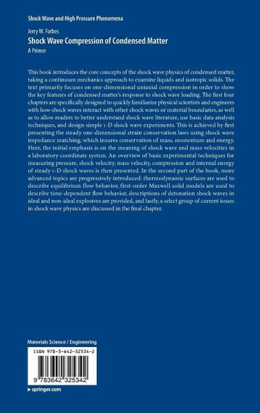 This book introduces the core concepts of the shock wave physics of condensed matter, taking a continuum mechanics approach to examine liquids and isotropic solids. The text primarily focuses on one-dimensional uniaxial compression in order to show the key features of condensed matter's response to shock wave loading. The first four chapters are specifically designed to quickly familiarize physical scientists and engineers with how shock waves interact with other shock waves or material boundaries, as well as to allow readers to better understand shock wave literature, use basic data analysis techniques, and design simple 1-D shock wave experiments. This is achieved by first presenting the steady one-dimensional strain conservation laws using shock wave impedance matching, which insures conservation of mass, momentum and energy. Here, the initial emphasis is on the meaning of shock wave and mass velocities in a laboratory coordinate system. An overview of basic experimental techniques for measuring pressure, shock velocity, mass velocity, compression and internal energy of steady 1-D shock waves is then presented. In the second part of the book, more advanced topics are progressively introduced: thermodynamic surfaces are used to describe equilibrium flow behavior, first-order Maxwell solid models are used to describe time-dependent flow behavior, descriptions of detonation shock waves in ideal and non-ideal explosives are provided, and lastly, a select group of current issues in shock wave physics are discussed in the final chapter.
