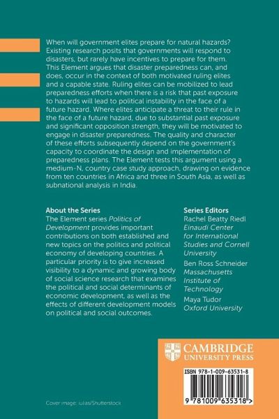 In this Element, the author argues that disaster preparedness can, and does, occur in the context of both motivated ruling elites and a capable state. Ruling elites can be mobilized to lead preparedness efforts when there is a risk that past exposure to hazards will lead to political instability in the face of a future hazard.