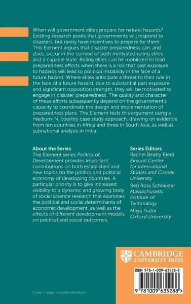 In this Element, the author argues that disaster preparedness can, and does, occur in the context of both motivated ruling elites and a capable state. Ruling elites can be mobilized to lead preparedness efforts when there is a risk that past exposure to hazards will lead to political instability in the face of a future hazard.