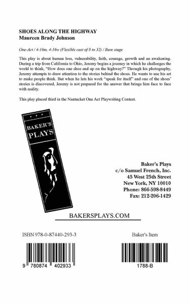 > One-Act Cahracters: 4 male, 4 female (Expanded cast possible) This play is about human loss, vulnerability, faith, courage, growth and an awakening. During a trip from California to Ohio, Jeremy begins a journey in which he challenges the world to think, "How does one shoe end up on the highway?" Through his photography, Jeremy attempts to draw attention to the stories behind the shoes. He wants to use his art to make people think. But when he lets his work "speak for itself" and