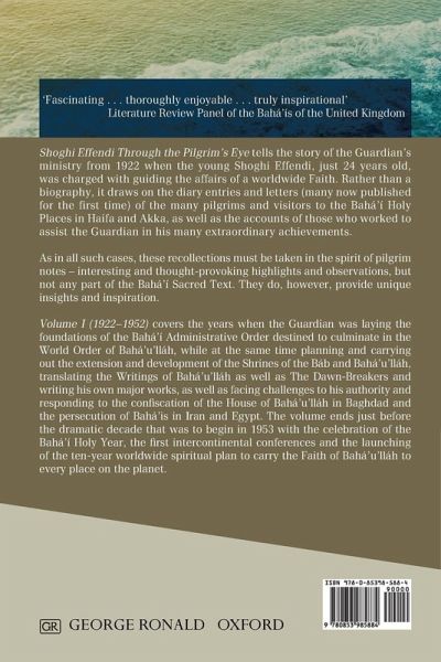 Shoghi Effendi Through the Pilgrim's Eye tells the story of the Guardian's ministry from 1922 when the young Shoghi Effendi, just 24 years old, was charged with guiding the affairs of a worldwide Faith. Rather than a biography, it draws on the diary entries and letters (many now published for the first time) of the many pilgrims and visitors to the Bahá'í Holy Places in Haifa and 'Akká, as well as the accounts of those who worked to assist the Guardian in his many extraordinary achievements. As in all such cases, these recollections must be taken in the spirit of pilgrim notes - interesting and thought-provoking highlights and observations, but not any part of the Bahá'í Sacred Text. They do, however, provide unique insights and inspiration. Volume I (1922-1952) covers the years when the Guardian was laying the foundations of the Bahá'í Administrative Order destined to culminate in the World Order of Bahá'u'lláh, while at the same time planning and carrying out the extension and development of the Shrines of the Báb and Bahá'u'lláh, translating the Writings of Bahá'u'lláh as well as The Dawn-Breakers and writing his own major works, as well as facing challenges to his authority and responding to the confiscation of the House of Bahá'u'lláh in Baghdad and the persecution of Bahá'ís in Iran and Egypt. The volume ends just before the dramatic decade that was to begin in 1953 with the celebration of the Bahá'í Holy Year, the first intercontinental conferences and the launching of the ten-year worldwide spiritual plan to carry the Faith of Bahá'u'lláh to every place on the planet. Pilgrims include: Agnes Alexander Effie Baker Músá and Samíhíh Banání Victoria Bedekian Lady Blomfield Nancy Bowditch Ted Cardell Stanwood and Nayyan Cobb Amelia Collins Genevieve Coy Ethel Dawe Alice Doolittle Sabrí Elias John Esslemont Nell French 'Alí-Akbar Furútan Ugo Giachery Hermann, Anna & Elsa Grossmann Philip Hainsworth Larry Hautz James Heggie Emogene Hoagg Leroy Ioas Marion Jack Dhikru'lláh Khádem Ali-Kuli Khan and Florence Abu'l-Qásim Khurásání Rom Landau May and Mary Maxwell Sutherland Maxwell Margery McCormick Muhammad Mustafa New Zealand Bahá'ís Sadie and Bertha Oglesby Mabel and Sylvia Paine Aziz Panahi Keith Ransom-Kehler Mason Remey Martha Root Ethel Rosenberg Emeric Sala Fred and Lorol Schopflocher May and Isabelle Stebbins Habíb Taherzadeh Juliet Thompson George Townshend Corinne True Gladys and Ben Weeden Albert Windust