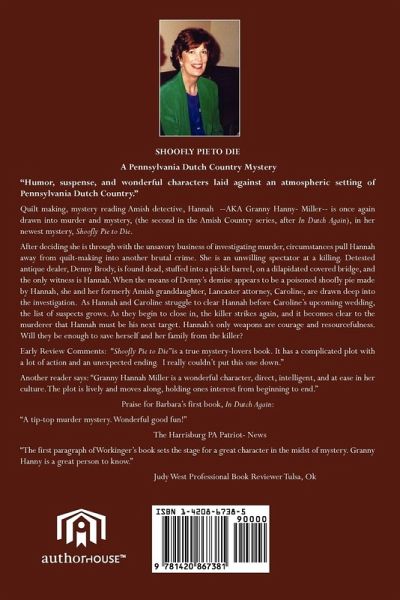 SHOOFLY PIE TO DIE- A Pennsylvania Dutch Country Mystery "Humor, suspense, and wonderful characters laid against an atmospheric setting of Pennsylvania Dutch Country." Quilt maker, mystery reading Amish detective, Hannah --AKA Granny Hanny-Miller is once again drawn into murder and mystery, (the second in the Amish Country series, after In Dutch Again), in her newest mystery, Shoofly Pie to Die. After deciding she is through with the unsavory like business of investigating murder, circumstances pull Hannah away from the quilt-making into another brutal crime. She is an unwilling spectator at a killing. Detested antique dealer Denny Brody is found dead, stuffed into a pickle barrel, on a dilapidated covered bridge, and the only witness is Hannah. When the means of Denny's demise appears to be a poisoned shoofly pie Hannah made by Hannah, she and her formerly Amish granddaughter, Lancaster attorney, Caroline, are drawn deep into the investigation. As Hannah and Caroline struggle to clear Hannah before Caroline's upcoming wedding, the list of suspects grows. As they begin to close in, the killer strikes again, and it becomes clear to the murderer that Hannah must be his next target. Hannah's only weapons are courage and resourcefulness. Will they be enough to save herself and her family from the killer? Early Review Comments: "Shoofly Pie to Die" is a true mystery-lovers book. It has a complicated plot with a lot of action and an unexpected ending. I really couldn't put this one down." Another reader says: "Granny Hannah Miller is a wonderful character, direct, intelligent, and at ease in her culture. The plot is lively and moves along, holding ones interest from beginning to end." Praise for Barbara's first book, In Dutch Again: