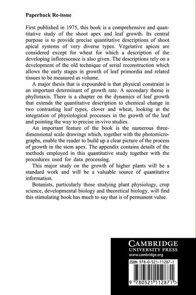 First published in 1975, this book is a comprehensive and quantitative study of the shoot apex and leaf growth. Its central purpose is to provide precise quantitative descriptions of shoot apical systems of very diverse types. Vegetative apices are considered except for wheat for which a description of the developing inflorescence is also given. The descriptions rely on a development of the old technique of serial reconstruction, which allows the early stages in growth of leaf primordia and related tissues to be measured as volume. An important feature of the book is the numerous three-dimensional scale drawings, which, together with the photomicrographs, enable the reader to build up a clear picture of the process of growth in the stem apex. The appendix contains details of the methods employed in this quantitative study together with the procedures used for data processing. This major study on the growth of higher plants will be a standard work and will be a valuable source of quantitative information. Botanists, particularly those studying plant physiology, crop science, developmental biology and theoretical biology, will find this stimulating book has much to say that is of permanent value.