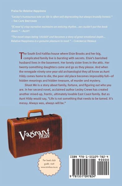 A new smaller format of Lesley Crewe's second novel, now with a reader's guide and author interview. The South End house where Elsie Brooks and her big, complicated family live is bursting with secrets. Elsie's banished husband lives in the basement. Her lonely sister lives in the attic. Her twenty-something daughters come and go as they please. And when the renegade ninety-one-year-old archaeologist they all know as Aunt Hildy comes home to die, the poor old place becomes impossibly full-of hidden meanings and hidden treasure, of murder and mystery. Shoot Me is a story about family, fortune, and figuring out who you are. Bestselling author Lesley Crewe has created a mixed-up, frantic, ultimately lovable East Coast family. But as Aunt Hildy would say, "Life is not something that needs to be tamed. It's messy. Always was, always will be."