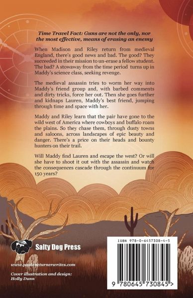 Time Travel Fact: Guns are not the only, nor the most effective, means of erasing an enemy When Madison and Riley return from medieval England, there's good news and bad. The good? They succeeded in their mission to un-erase a fellow student. The bad? A stowaway from the time period turns up in Maddy's science class, seeking revenge. The assassin tries to worm their way into Maddy's friend group and, with barbed comments and dirty tricks, force her out. Then they go further and kidnap Maddy's best friend, jumping through time and space with her. Maddy and Riley learn that the pair have gone to the wild west of America where cowboys and buffalo roam the plains. So they chase them, through dusty towns and saloons, across landscapes of epic beauty and danger. There's a price on their heads and bounty hunters on their trail. Will Maddy find her friend and escape the west? Or will she have to shoot it out with the assassin and watch the consequences cascade through the continuum for 150 years? A high-stakes fast-paced time travel adventure through the Wild West.