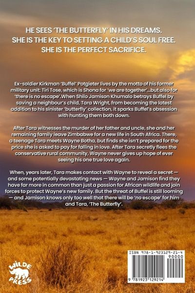 He sees 'the butterfly' in his dreams. She is the key to setting a child's soul free. She is the perfect sacrifice. Ex-soldier Kirkman 'Buffel' Potgieter lives by the motto of his former military unit: Tiri Tose, which is Shona for 'we are together'...but also for 'there is no escape'. When Shilo Jamison Khumalo betrays Buffel by saving a neighbour's child, Tara Wright, from becoming the latest addition to his sinister 'butterfly' collection, it sparks Buffel's obsession with hunting them both down. After Tara witnesses the murder of her father and uncle, she and her remaining family leave Zimbabwe for a new life in South Africa. There, a teenage Tara meets Wayne Botha, but finds she isn't prepared for the price she is asked to pay for falling in love. After Tara secretly flees the conservative rural community, Wayne never gives up hope of ever seeing his one true love again. When, years later, Tara makes contact with Wayne to reveal a secret - and some potentially devastating news - Wayne and Jamison find they have far more in common than just a passion for African wildlife and join forces to protect Wayne's new family. But the threat of Buffel is still looming - and Jamison knows only too well that there will be 'no escape' for him and Tara, 'The Butterfly'.