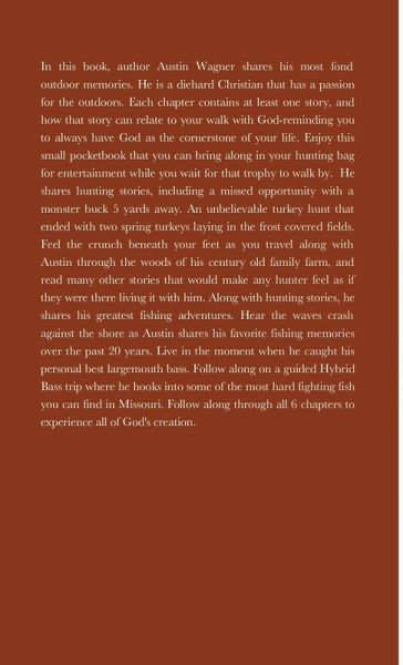 I, Austin Wagner, share several hunting and fishing stories from my life. I allow you to live the adventures with me as we walk through frost covered fields and hear the splash of a lure breaking the surface of the water. I wanted to share these experiences as a way of honoring God with the life he provided me. Within each story is a hidden message that I reveal later in each chapter relating that particular story to our walk with God. Each of the 6 chapters are devotionals using my stories. My goal is to help you, as the reader, find the hidden messages that God has provided you in your life and share those stories with people around you.