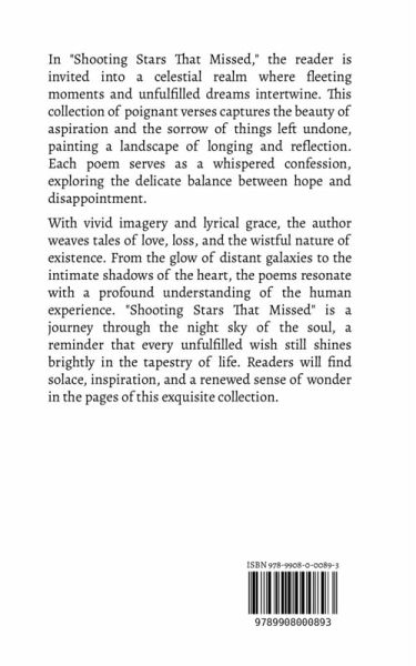 In "Shooting Stars That Missed," the reader is invited into a celestial realm where fleeting moments and unfulfilled dreams intertwine. This collection of poignant verses captures the beauty of aspiration and the sorrow of things left undone, painting a landscape of longing and reflection. Each poem serves as a whispered confession, exploring the delicate balance between hope and disappointment. With vivid imagery and lyrical grace, the author weaves tales of love, loss, and the wistful nature of existence. From the glow of distant galaxies to the intimate shadows of the heart, the poems resonate with a profound understanding of the human experience. "Shooting Stars That Missed" is a journey through the night sky of the soul, a reminder that every unfulfilled wish still shines brightly in the tapestry of life. Readers will find solace, inspiration, and a renewed sense of wonder in the pages of this exquisite collection.