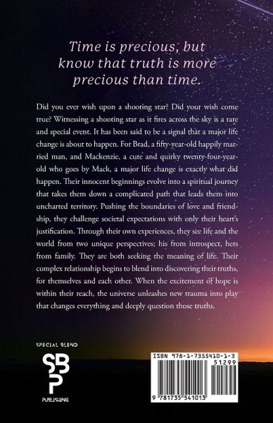 The problem with most stories about love is that they lose the truth in the romance or lose the romance in the truth. Shooting Stars some-how holds onto them both. It is a wondrous story that in some ways feels too special to be true, but in others too real to be special. It's an escape and an adventure, but the situations are so real and the emotions so true that, like even the best of life, it comes sprinkled with pain. It's been said that the greatest hurt is never having tried to climb the mountains of your dreams and dared facing the rapids taking you back down. In our world today, our fears so outweigh our dreams that it is rare to find someone willing to take the risk. This is a story about people who did. As a young boy, Brad would sit out on his back porch at night staring at the sky, patiently waiting to witness a shooting star. When he did, it would be followed by a wish. There were so many things to wish for with his life all in front of him. Now, having just turned 50, he sees the life he was wishing for as fleeting as a shooting star. Mackenzie, an undefinable young lady known as Mack to most people, finds herself right where she is supposed to be for her stage in life; but it isn't enough for her. When Brad and Mack have a chance encounter at her store, it begins an innocent and unlikely journey down a path that neither saw coming. They both experience a new spark in their lives, unique to both but powered by their connection. The author has taken these two quirky, idiosyncratic characters from their own established, socially designed roles, but from completely different worlds, and has created a story that brings them together despite the obstacles created by the status quo. This book questions that status quo and challenges the reader to think beyond what is traditionally expected and accepted. Did you ever wish on a shooting star? Did your wish come true? For Brad and Mackenzie a major life change is what happened. Their innocent beginnings evolve into a spiritual journey that takes them down a complicated path that leads them into uncharted territory. Pushing the boundaries of love and friendship, they challenge societal expectations with only their heart's justification. Through their own experiences, they see life and the world from two unique perspectives; his from introspect, hers from family. They are both seeking the meaning of life. Their complex relationship begins to blend into discovering their truths, for themselves and each other. When the excitement of hope is within their reach, the universe unleashes new trauma into play that changes everything and deeply question those truths. Time is precious. This book is worth the time. Fans of The Shack and The Notebook will like this book!