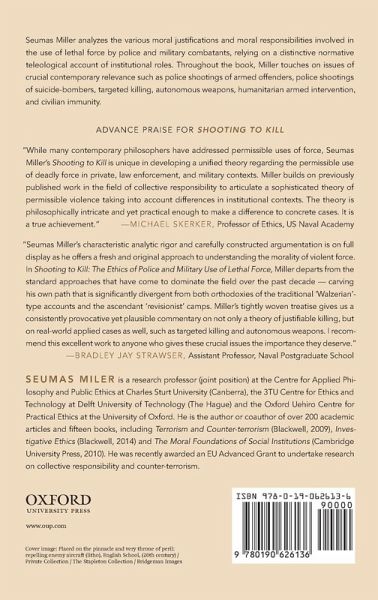 Terrorism, the use of military force in Afghanistan, Iraq and Syria, and the fatal police shootings of unarmed persons have all contributed to renewed interest in the ethics of police and military use of lethal force and its moral justification. In this book, philosopher Seumas Miller analyzes the various moral justifications and moral responsibilities involved in the use of lethal force by police and military combatants, relying on a distinctive normative teleological account of institutional roles. His conception constitutes a novel alternative to prevailing reductive individualist and collectivist accounts. As Miller argues, police and military uses of lethal force are morally justified in part by recourse to fundamental natural moral rights and obligations, especially the right to personal self-defense and the moral obligation to defend the lives of innocent others. Yet the moral justification for police and military use of lethal force is to some extent role-specific. Both police officers and military combatants evidently have an institutionally-based moral duty to put themselves in harm's way to protect others. Under some circumstances, however, police have an institutionally based moral duty to use lethal force to uphold the law; and military combatants have an institutionally based moral duty to use lethal force to win wars. Two key notions in play are joint action and the natural right to self-defense. Miller uses a relational individualist theory of joint actions to construct the notion of multi-layered structures of joint action in order to explicate organizational action. He also provides a novel theory of justifiable killing in self-defense. Over the course of his book, Miller covers a variety of urgent topics, such as police shootings of armed offenders, police shooting of suicide-bombers, targeted killing, autonomous weapons, humanitarian armed intervention, and civilian immunity.