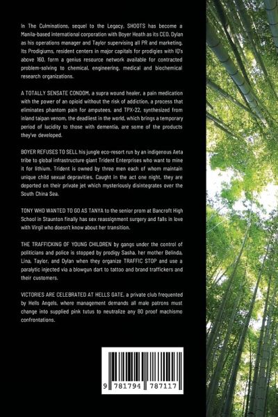 In The Culminations, sequel to the Legacy, SHOOTS has become a Manila-based international corporation with Boyer Heath as its CEO, Dylan as his operations manager and Taylor supervising all PR and marketing. Its Prodigiums, resident centers in major capitals for prodigies with IQ's above 160, form a genius resource network available for contracted problem-solving to chemical, engineering, medical and biochemical research organizations. A totally sensate condom, a supra wound healer, a pain medication with the power of an opioid without the risk of addiction, a process that eliminates phantom pain for amputees, and TPX-22, synthesized from inland taipan venom, the deadliest in the world, which brings a temporary period of lucidity to those with dementia, are some of the products they've developed. Boyer refuses to sell his jungle eco-resort run by an indigenous Aeta tribe to global infrastructure giant Trident Enterprises who want to mine it for lithium. Trident is owned by three men each of whom maintain unique child sexual depravities. Caught in the act one night, they are deported on their private jet which mysteriously disintegrates over the South China Sea. Tony who wanted to go as Tanya to the senior prom at Bancroft High School in Staunton finally has sex reassignment surgery and falls in love with Virgil who doesn't know about her transition. The trafficking of young children by gangs under the control of politicians and police is stopped by prodigy Sasha, her mother Belinda, Lina, Taylor, and Dylan when they organize TRAFFIC STOP and use a paralytic injected via a blowgun dart to tattoo and brand traffickers and their customers. Victories are celebrated at HELLS GATE, a private club frequented by Hells Angels, where management demands all male patrons must change into supplied pink tutus to neutralize any 80 proof machismo confrontations.