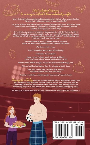 I don't understand Americans. Or, as we say in Scotland, I dinna understand ye eedjits. And I definitely dinna understand the crazy mother-in-law of my cousin Declan. Who in their right mind names a wee dog Chuffy? I'm stuck in New York after ma agent makes a bloody mess of an otherwise good endorsement contract for a sports towel company, and this crazy American holiday-Thanksgiving-is in two days. The invitation to spend it in Mendon, Massachusetts, with the Jacoby family is about as appealing as rotten haggis. As far as I can tell, Thanksgiving is about stuffing yerself silly, watching pathetic American "football," while fighting with relatives ye only see once a year. If I wanted that last one, I'd head back to Scotland, where we dinna need a holiday to be salty to each other. Ma firm answer is nae. Until I remember Amy is part of the family. Suddenly, I'm available. Eager, even. Perhaps she'll pull ma wishbone. I hear that's part of the Turkey Day festivities, aye? What I canna admit, though, is how she pulls ma heartstrings, too. Which shouldna feel better than the wishbone, but it does. And here comes Amy's mother with another holiday tradition, this one a bit early. A sprig o' mistletoe, dangling right above Amy's bonnie head. -- Shopping for a Turkey features Scottish football player Hamish McCormick and Amy Jacoby as they navigate unusual cultural norms, new traditions, and the undeniable attraction between these two characters, who have appeared as supporting players in Julia Kent's New York Times-bestselling Shopping series. It's their turn to have their own all-new spinoff series. And to pull the wishbone. ;)