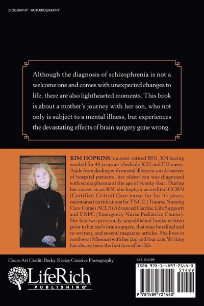 Although the diagnosis of schizophrenia is not a welcome one and comes with unexpected changes to life, there are also lighthearted moments. This book is about a mother's journey with her son, who not only is subject to a mental illness, but experiences the devastating effects of brain surgery gone wrong.