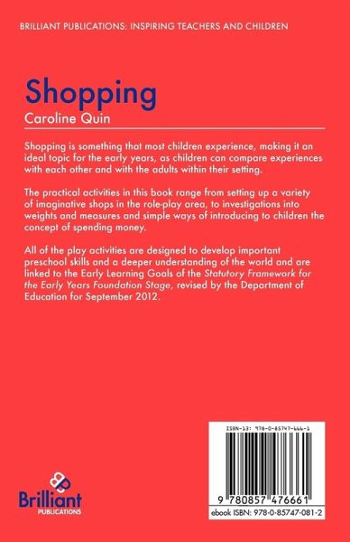 Shopping is something that most children experience, making it an ideal topic for the early years, as children can compare experiences with each other and with the adults within their setting. The practical activities in this book range from setting up a variety of imaginative shops in the role-play area, to investigations into weights and measures and simple ways of introducing to children the concept of spending money. All of the play activities are designed to develop important preschool skills and a deeper understanding of the world and are linked to the Early Learning Goals of the Statutory Framework for the Early Years Foundation Stage, revised by the Department of Education for September 2012.