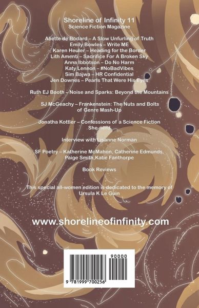 All women special edition celebrating International Women's Day - and beyond! Dedicated to the memory of Ursula K Le Guin Stories: Aliette de Bodard – A Slow Unfurling of Truth Emily Bowles – Write ME Karen Heuler – Heading for the Border Lith Amenti – Sacrifice For A Broken Sky Anna Ibbotson – Do No Harm Katy Lennon – #NoBadVibes Sim Bajwa – HR Confidentia Jen Downes – Pearls That Were His Eyes Articles SJ McGeachy on Frankenstein: The Nuts and Bolts of Genre Mash-Up Jonatha Kottler – Confessions of a Science Fiction She-nerd Interview: Lisanne Norman and Ruth EJ Booth regular column – Noise and Sparks: Beyond the Mountains SF poetry by: Katherine McMahon, Catherine Edmunds, Paige Smith, Katie Fanthorpe Aliette de Bodard, Emily Bowles, Karen Heuler, Lith Amenti, Anna Ibbotson, Katy Lennon, Sim Bajwa, Jen Downes Artists: Caroline Grebbell, M Luke McDonnell, Jackie Duckworth ,Carol Wellart, Jessica Good, Becca McCall, Grace Wilson Cover by: Siobhan McDonald
