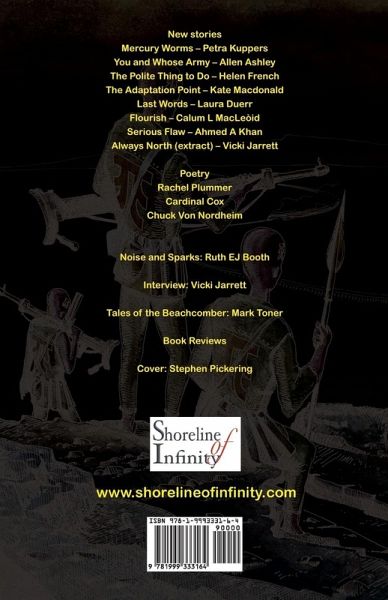 Shoreline of Infinity is the winner of the British Fantasy Society Award 2018 for best magazine/periodical. Stories Petra Kuppers Allen Ashley Helen French Kate Macdonald Laura Duerr Calum L. MacLeòid Ahmed A. Khan Vicki Jarrett Interview with Vicki Jarrett Noise and Sparks from Ruth EJ Booth SF Poetry Rachel Plummer Cardinal Cox Chuck Von Nordheim Plus Mark Toner's Tales of the Beachcomber Book Reviews