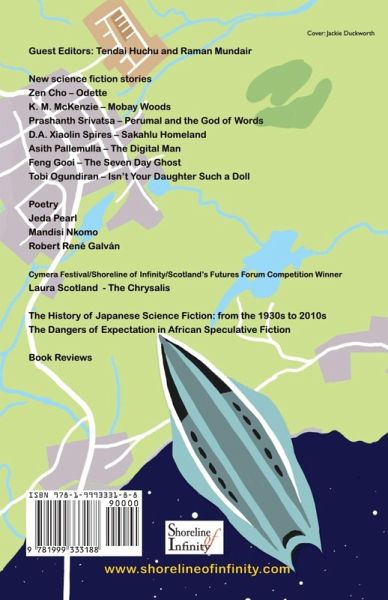 Spotlight on BAME science fiction Guest Editors: Tendai Huchu and Raman Mundair New stories from: Feng Gooi, Tobi Ogundiran, Prashanth Srivatsa, K.M. McKenzie, Asith Pallemulla, D.A. Xiaolin Spires, Zen Cho SF poetry from: Jeda Pearl, Mandisi Nkomo, Robert René Galván The History of Japanese Science Fiction: from the 1930s to 2010s The Dangers of Expectation in African Speculative Fiction Plus: The Chrysalis by Laura Scotland - the winner of Cymera, Scotland's Futures Forum and Shoreline of Infinity's Competition for speculative short fiction 2020 Book Reviews Original artwork Shoreline of Infinity Science Fiction Magazine is the winner of the British Fantasy Society Award 2018 for best magazine/periodical.