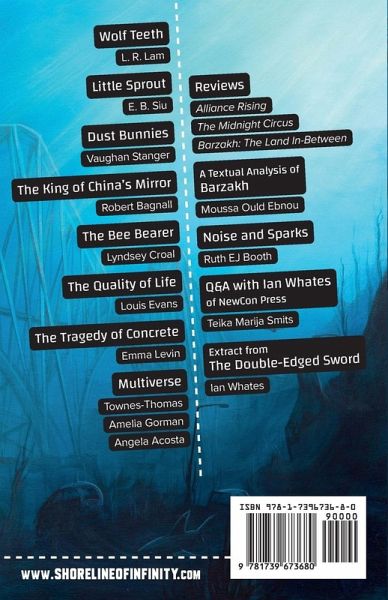 Science Fiction Magazine featuring new stories, poetry, artwork, articles, reviews and interviews. Pull up a Log - Eris Young Wolf Teeth - L. R. Lam Little Sprout - E. B. Siu Dust Bunnies - Vaughan Stanger The King of China's Mirror - Robert Bagnall The Quality of Life - Louis Evans The Bee Bearer - Lyndsey Croal Multiverse - Townes-Thomas, Amelia Gorman and Angela Acosta Reviews - Alliance Rising, The Midnight Circus, Barzakh: The Land In-Between A Textual Analysis of Barzakh - Moussa Ould Ebnou Noise and Sparks - Ruth EJ Booth The Tragedy of Concrete - Emma Levin Q&A with Ian Whates of NewCon Press - Teika Marija Smits asks the questions (Extract) The Double-Edged Sword - Ian Whates