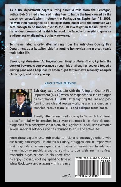 As a fire department captain living about a mile from the Pentagon, author Bob Gray led a team of firefighters to battle the fires caused by the passenger aircraft when it struck the Pentagon on September 11, 2001. He was then reassigned as a collapse team leader until the structure was safe enough to be handed over to the FBI investigation teams. Never in his wildest dreams did he think he would be faced with anything quite as perilous and challenging. But he was wrong. Ten years later, shortly after retiring from the Arlington County Fire Department as a battalion chief, a routine home-cleaning project nearly took Bob's life. Shoring Up Ourselves: An Inspiring Story of Never Giving Up tells the story of how Bob's perseverance through his challenging recovery forged a driving passion to help inspire others fight for their own recovery, conquer challenges, and never give up.