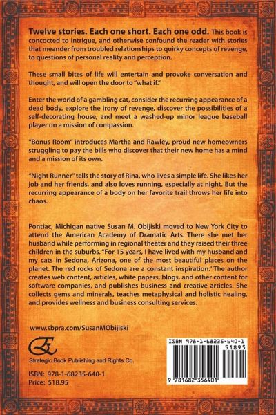 Twelve stories. Each one short. Each one odd. This book is concocted to intrigue, and otherwise confound the reader with stories that meander from troubled relationships to quirky concepts of revenge, to questions of personal reality and perception.These small bites of life will entertain and provoke conversation and thought, and will open the door to "what if."Enter the world of a gambling cat, consider the recurring appearance of a dead body, explore the irony of revenge, discover the possibilities of a self-decorating house, and meet a washed-up minor league baseball player on a mission of compassion."Bonus Room" introduces Martha and Rawley, proud new homeowners struggling to pay the bills who discover that their new home has a mind and a mission of its own. "Night Runner" tells the story of Rina, who lives a simple life. She likes her job and her friends, and also loves running, especially at night. But the recurring appearance of a body on her favorite trail throws her life into chaos. (About the Author) Pontiac, Michigan native Susan M. Obijiski moved to New York City to attend the American Academy of Dramatic Arts. There she met her husband while performing in regional theater and they raised their three children in the suburbs. "For 15 years, I have lived with my husband and my cats in Sedona, Arizona, one of the most beautiful places on the planet. The red rocks of Sedona are a constant inspiration." The author creates web content, articles, white papers, blogs, and other content for software companies, and publishes business and creative articles. She collects gems and minerals, teaches metaphysical and holistic healing, and provides wellness and business consulting services.