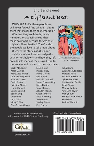 Who are they, these people we will never forget? And what is it about them that makes them so memorable? Whether they are friends, family members, or acquaintances, they make an impact because they're true originals. One-of-a-kind. They're also the people we love to tell others about. Discover the stories of 41 unique individuals who have left an indelible mark on the world as they stay true to themselves and dance to their own beat. Contributors: Becky Alexander, Karen O. Allen, Mary Alice Archer, Lanita Bradley Boyd, Nancy Brashear, David Buster, Julie Ann Chase, Jeanie Connell, Dennis Conrad, Bonnie Culp, Lin Daniels, Jorja Davis, Nicey T. Eller, Pam Groupe Groves, Leah Hinton, Patricia Huey, Penny L. Hunt, Liz Kimmel, Ali Larkin Kincaid, Susan Cheeves King, Rachel Lulich, Terry Magness, Jill Allen Maisch, Cristina Moore, Alice H. Murray, Tony Nester, Shelley Pierce, Ken Proctor, Reba Rhyne, Susanna Shutz Robar, Marcella Ruch, Michelle Ruschman, Cybele Sieradzki, Lisa Worthey Smith, Judee Stapp, Marilyn Switzer, Amy Lynn Taylor, Marilyn Turk, Kenneth Avon White, Kim Wilch, Andrea Woronick