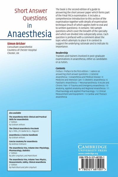 Vastly expanded and completely re-written, this is the definitive companion and revision aid for the short answer paper which forms part of the Final FRCA examination. It includes a comprehensive introduction to this section of the examination together with details of examination technique (much of which applies both to oral and to written questions). It contains 180 sample questions which cover the breadth of the specialty and which are divided into subspecialty areas. Each question is prefaced with a comment about the topic which attempts to place it in context to suggest the underlying rationale and to indicate its importance.