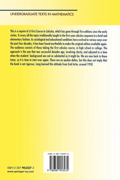 "This is a reprint of the original edition of Lang's A first course in calculus, which was first published in 1964. ... The treatment is 'as rigorous as any mathematician would wish it' ... . There are quite a lot of exercises ... they are refreshingly simply stated, without any extraneous verbiage, and at times quite challenging. ... There are answers to all the exercises set and some supplementary problems on each topic to tax even the most able." (Gerry Leversha, The Mathematical Gazette, Vol. 86 (507), 2002)