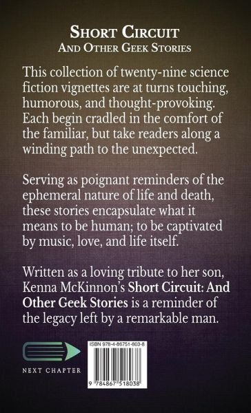 "We all have our memories; the guitar still sang..." This collection of twenty-nine science fiction vignettes are at turns touching, humorous, and thought-provoking. Each begin cradled in the comfort of the familiar, but take readers along a winding path to the unexpected. Serving as poignant reminders of the ephemeral nature of life and death, these stories encapsulate what it means to be human; to be captivated by music, love, and life itself. Written as a loving tribute to her son, Kenna McKinnon's Short Circuit: And Other Geek Stories is a reminder of the legacy left by a remarkable man.