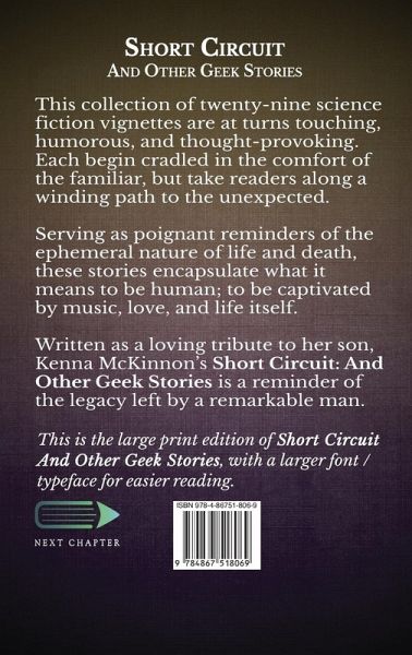"We all have our memories; the guitar still sang..." This collection of twenty-nine science fiction vignettes are at turns touching, humorous, and thought-provoking. Each begin cradled in the comfort of the familiar, but take readers along a winding path to the unexpected. Serving as poignant reminders of the ephemeral nature of life and death, these stories encapsulate what it means to be human; to be captivated by music, love, and life itself. Written as a loving tribute to her son, Kenna McKinnon's Short Circuit: And Other Geek Stories is a reminder of the legacy left by a remarkable man. This is the large print edition of Short Circuit: And Other Geek Stories, with a larger font / typeface for easier reading.