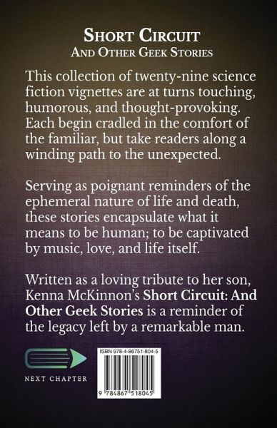 "We all have our memories; the guitar still sang..." This collection of twenty-nine science fiction vignettes are at turns touching, humorous, and thought-provoking. Each begin cradled in the comfort of the familiar, but take readers along a winding path to the unexpected. Serving as poignant reminders of the ephemeral nature of life and death, these stories encapsulate what it means to be human; to be captivated by music, love, and life itself. Written as a loving tribute to her son, Kenna McKinnon's Short Circuit: And Other Geek Stories is a reminder of the legacy left by a remarkable man.
