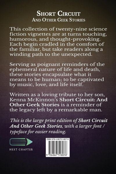 "We all have our memories; the guitar still sang..." This collection of twenty-nine science fiction vignettes are at turns touching, humorous, and thought-provoking. Each begin cradled in the comfort of the familiar, but take readers along a winding path to the unexpected. Serving as poignant reminders of the ephemeral nature of life and death, these stories encapsulate what it means to be human; to be captivated by music, love, and life itself. Written as a loving tribute to her son, Kenna McKinnon's Short Circuit: And Other Geek Stories is a reminder of the legacy left by a remarkable man. This is the large print edition of Short Circuit: And Other Geek Stories, with a larger font / typeface for easier reading.