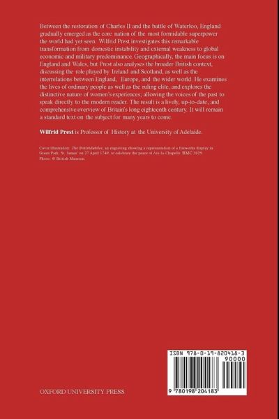 Between the restoration of Charles II and the battle of Waterloo, England gradually emerged as the core nation of the most formidable superpower the world had yet seen. Wilfrid Prest investigates this remarkable transformation from domestic instability and external weakness to global, economic, and military predominance. Geographically, the main focus is on England and Wales, but Prest also analyses the broader British context, discussing the role played by Ireland and Scotland, as well as the interrelations between England, Europe, and the wider world. He examines the lives of ordinary people as well as the ruling elite, and explores the distinctive nature of women's experiences, allowing the voices of the past to speak directly to the modern reader. The result is a lively, up-to-date, and comprehensive overview of Britain's 'long eighteenth century'. It will remain a standard text on the subject for many years to come.