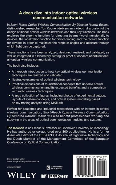 A deep dive into indoor optical wireless communication networks In Short-Reach Optical Wireless Communication: By Directed Narrow Beams, distinguished researcher Ton Koonen delivers an in-depth discussion of the design of indoor optical wireless networks and their key functions. The book explores the steering function for directing beams two-dimensionally to devices, the localization function for device finding and the receive function for devices in order to maximize the range of angles and aperture through which light can be captured. These functions have been analyzed, designed, realized, and validated, as well as integrated in a laboratory setting for proof of concept of bidirectional all-optical wireless communication. The book also includes: * A thorough introduction to how key optical wireless communication techniques are realized and validated * Illustrative examples of optical wireless technology * Practical discussions of foundational concepts that underlie optical wireless communication and its expected benefits, and a comparison with radio wireless techniques * A large collection of figures, including photos of experimental setups, layouts of system concepts, and optical system modelling based on ray tracing analysis using MATLAB Perfect for academic and industrial researchers with an interest in optical wireless communication, Short-Reach Optical Wireless Communication: By Directed Narrow Beams will also benefit professionals working and studying in the areas of optical communication modules and systems.