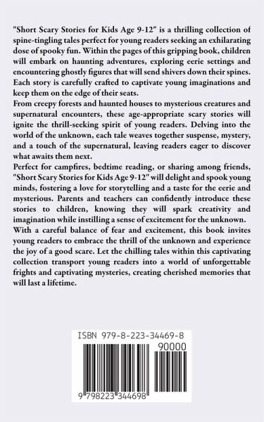 "Short Scary Stories for Kids Age 9-12" is a thrilling collection of spine-tingling tales perfect for young readers seeking an exhilarating dose of spooky fun. Within the pages of this gripping book, children will embark on haunting adventures, exploring eerie settings and encountering ghostly figures that will send shivers down their spines. Each story is carefully crafted to captivate young imaginations and keep them on the edge of their seats. From creepy forests and haunted houses to mysterious creatures and supernatural encounters, these age-appropriate scary stories will ignite the thrill-seeking spirit of young readers. Delving into the world of the unknown, each tale weaves together suspense, mystery, and a touch of the supernatural, leaving readers eager to discover what awaits them next. Perfect for campfires, bedtime reading, or sharing among friends, "Short Scary Stories for Kids Age 9-12" will delight and spook young minds, fostering a love for storytelling and a taste for the eerie and mysterious. Parents and teachers can confidently introduce these stories to children, knowing they will spark creativity and imagination while instilling a sense of excitement for the unknown. With a careful balance of fear and excitement, this book invites young readers to embrace the thrill of the unknown and experience the joy of a good scare. Let the chilling tales within this captivating collection transport young readers into a world of unforgettable frights and captivating mysteries, creating cherished memories that will last a lifetime.