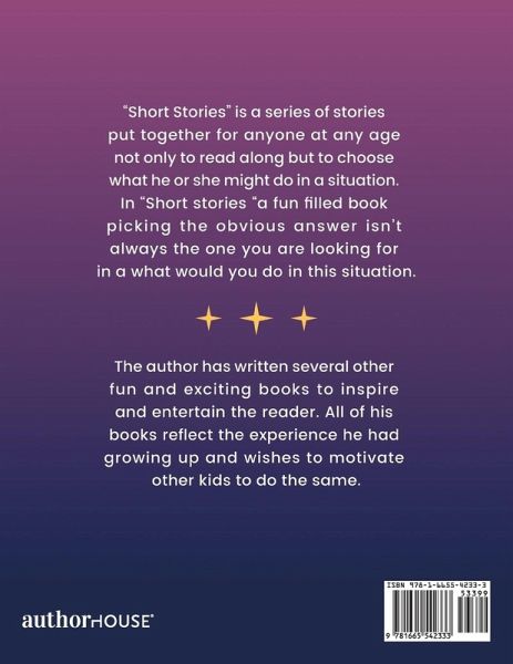 "Short Stories" is a series of stories put together for anyone at any age not only to read along but to choose what he or she might do in a situation. In "Short stories "a fun filled book picking the obvious answer isn't always the one you are looking for in a what would you do situation.