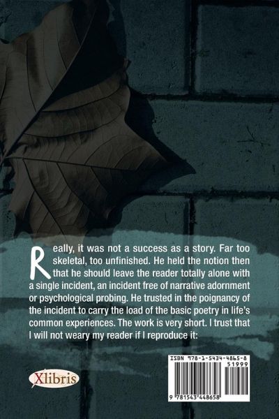 Really, it was not a success as a story. Far too skeletal, too unfinished. He held the notion then that he should leave the reader totally alone with a single incident, an incident free of narrative adornment or psychological probing. He trusted in the poignancy of the incident to carry the load of the basic poetry in life's common experiences. The work is very short. I trust that I will not weary my reader if I reproduce it: