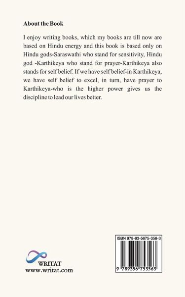 I enjoy writing books ,which my books are till now are based on Hindu energy and this book is based only on Hindu gods-Saraswathi who stand for senstivity,Hindu god -Karthikeya who stand for prayer-Karthikeya also stands for self belief.If we have self belief-in Karthikeya ,we have self belief to excel, in turn, have prayer to Karthikeya-who is the higher power gives us the discipline to lead our lives better