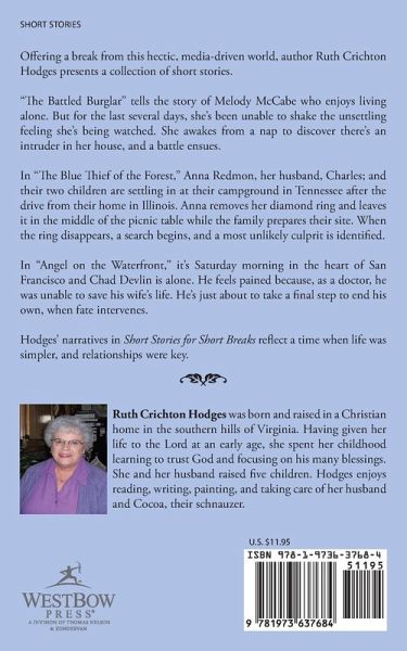 Offering a break from this hectic, media-driven world, author Ruth Crichton Hodges presents a collection of short stories. The Battled Burglar tells the story of Melody McCabe who enjoys living alone. But for the last several days, shes been unable to shake the unsettling feeling shes being watched. She awakes from a nap to discover theres an intruder in her house, and a battle ensues. In The Blue Thief of the Forest, Anna Redmon, her husband, Charles; and their two children are settling in at their campground in Tennessee after the drive from their home in Illinois. Anna removes her diamond ring and leaves it in the middle of the picnic table while the family prepares their site. When the ring disappears, a search begins, and a most unlikely culprit is identified. In Angel on the Waterfront, its Saturday morning in the heart of San Francisco and Chad Devlin is alone. He feels pained because, as a doctor, he was unable to save his wifes life. Hes just about to take a final step to end his own, when fate intervenes. Hodges narratives in Short Stories for Short Breaks reflect a time when life was simpler, and relationships were key.