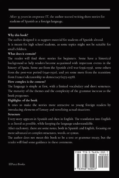 Why this book? The author designed it as support material for students of Spanish abroad. It is meant for high school students, as some topics might not be suitable for small children. What does it contain? The reader will find short stories for beginners. Some have a historical background to help readers become acquainted with important events in the history of Spain. Some are from the Spanish civil war (1936-1939), some others from the post-war period (1940-1950), and yet some more from the transition from Franco's dictatorship to democracy (1975-1978). How complex is the content? The language is simple at first, with a limited vocabulary and short sentences. The maturity of the themes and the complexity of the grammar increase as the book progresses. Highlights of the book It tries to make the stories more attractive to young foreign readers by introducing elements of fantasy and novelizing actual situations. Structure Every story appears in Spanish and then in English. The translation into English is as literal as possible, while keeping the language understandable. After each story, there are some notes, both in Spanish and English, focusing on more advanced or complex structures, words, or syntax. The author does not mean this book to be a text or grammar treaty, but the reader will find some guidance in these comments.