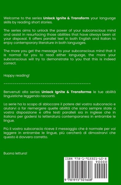 Short Stories in English/Italian - Parallel TextUnlock Ignite & Transform Your Language Skills with Contemporary Romance Welcome to the series Unlock Ignite & Transform your language skills by reading short stories. The series aims to unlock the power of your subconscious mind and assist in resurfacing those abilities that have always been at your disposal. It offers parallel text in both English and Italian to enjoy contemporary literature in both languages. The more you get the message to your subconscious mind that it is normal for you to read either language, the more your subconscious will try to demonstrate to you that this is indeed correct. The second short story in the series is A New York Adventure. Troubled with sorrow after the break-up of a long-term relationship, Gabrielle sets out for a sabbatical in New York. A travelogue searching for self, pleasure and fun. And the Big Apple doesn't disappoint. Happy reading! ----------------------------------------------- Benvenuti alla series Unlock Ignite & Transforma le tue abilità linguistiche leggendo racconti. La serie ha lo scopo di sbloccare il potere del vostro subconscio e aiutarvi a far riemergere quelle abilità che sono sempre state a vostra disposizione e offre testi paralleli sia in inglese che in italiano per godersi la letteratura contemporanea in entrambe le lingue. Più il vostro subconscio riceve il messaggio che è normale per voi leggere in entrambe le lingue, più cercherà di dimostrarvi che questo è davvero corretto. Il secondo racconto incluso in questo serie è Un'Avventure NewYorkese. Turbata dopo la fine di una relazione a lungo termine, Gabrielle parte per un sabbatico a New York. Un diario di viaggio alla ricerca di sé, del piacere e del divertimento. E la Grande Mela non delude. Buona lettura!