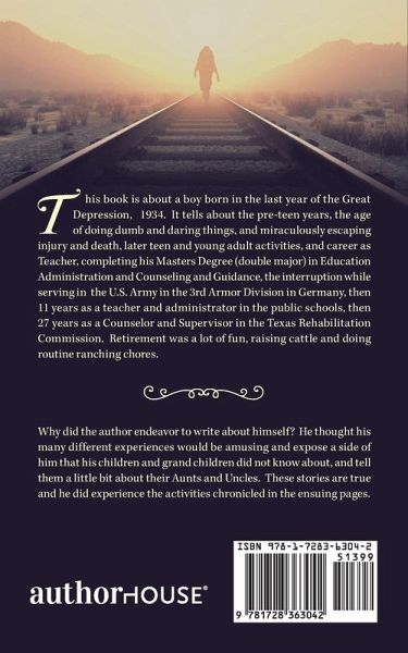 This book is about a boy born in the last year of the Great Depression, 1934. It tells about the pre-teen years, the age of doing dumb and daring things, and miraculously escaping injury and death, later teen and young adult activities, and career as Teacher, completing his Masters Degree (double major) in Education Administration and Counseling and Guidance, the interruption while serving in the U.S. Army in the 3rd Armor Division in Germany, then 11 years as a teacher and administrator in the public schools, then 27 years as a Counselor and Supervisor in the Texas Rehabilitation Commission. Retirement was a lot of fun, raising cattle and doing routine ranching chores.