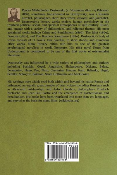 Fyodor Mikhailovich Dostoevsky (11 November 1821 - 9 February 1881), sometimes transliterated as Dostoyevsky, was a Russian novelist, philosopher, short story writer, essayist, and journalist. Dostoevsky's literary works explore human psychology in the troubled political, social, and spiritual atmospheres of 19th-century Russia, and engage with a variety of philosophical and religious themes. His most acclaimed works include Crime and Punishment (1866), The Idiot (1869), Demons (1872), and The Brothers Karamazov (1880). Dostoevsky's body of works consists of 12 novels, four novellas, 16 short stories, and numerous other works. Many literary critics rate him as one of the greatest psychological novelists in world literature. His 1864 novel Notes from Underground is considered to be one of the first works of existentialist literature. Dostoevsky was influenced by a wide variety of philosophers and authors including Pushkin, Gogol, Augustine, Shakespeare, Dickens, Balzac, Lermontov, Hugo, Poe, Plato, Cervantes, Herzen, Kant, Belinsky, Hegel, Schiller, Solovyov, Bakunin, Sand, Hoffmann, and Mickiewicz. His writings were widely read both within and beyond his native Russia and influenced an equally great number of later writers including Russians such as Aleksandr Solzhenitsyn and Anton Chekhov, philosophers Friedrich Nietzsche and Jean-Paul Sartre and the emergence of Existentialism and Freudianism. His books have been translated into more than 170 languages, and served as the basis for many films. (wikipedia.org)