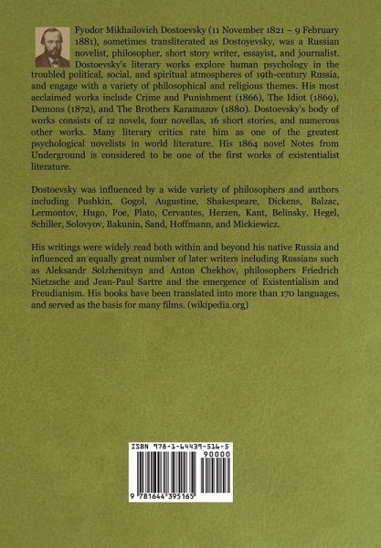 Fyodor Mikhailovich Dostoevsky (11 November 1821 - 9 February 1881), sometimes transliterated as Dostoyevsky, was a Russian novelist, philosopher, short story writer, essayist, and journalist. Dostoevsky's literary works explore human psychology in the troubled political, social, and spiritual atmospheres of 19th-century Russia, and engage with a variety of philosophical and religious themes. His most acclaimed works include Crime and Punishment (1866), The Idiot (1869), Demons (1872), and The Brothers Karamazov (1880). Dostoevsky's body of works consists of 12 novels, four novellas, 16 short stories, and numerous other works. Many literary critics rate him as one of the greatest psychological novelists in world literature. His 1864 novel Notes from Underground is considered to be one of the first works of existentialist literature. Dostoevsky was influenced by a wide variety of philosophers and authors including Pushkin, Gogol, Augustine, Shakespeare, Dickens, Balzac, Lermontov, Hugo, Poe, Plato, Cervantes, Herzen, Kant, Belinsky, Hegel, Schiller, Solovyov, Bakunin, Sand, Hoffmann, and Mickiewicz. His writings were widely read both within and beyond his native Russia and influenced an equally great number of later writers including Russians such as Aleksandr Solzhenitsyn and Anton Chekhov, philosophers Friedrich Nietzsche and Jean-Paul Sartre and the emergence of Existentialism and Freudianism. His books have been translated into more than 170 languages, and served as the basis for many films. (wikipedia.org)
