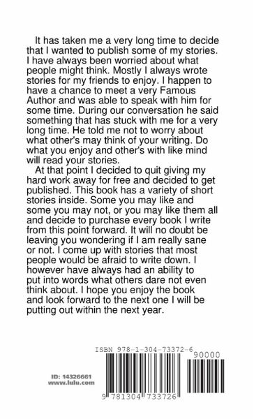 This is a book of short stories that come right out of my twisted mind right onto the paper for you to enjoy. Some of the stories in this book are not for everyone and some will like them all. No doubt whom ever you are this book will leave you questioning things you have never thought about or even wanted to think about. I expect some of you will like one or two of the stories and yet others will like them all at the same time there are a few of you out there that won't like any of them. I do not pretend that I can please everyone but I only want to please the ones that like my writing.