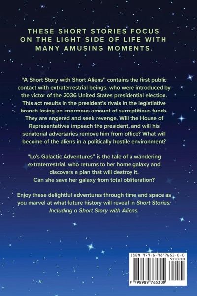 The amiable extraterrestrials in the novella, Short Stories: Including a Short Story with Short Aliens, dispel the myth of hostile aliens. These stories focus on the light side of life with many amusing moments. "A Short Story with Short Aliens" contains the first public contact with extraterrestrial beings, who were introduced by the victor of the 2036 United States presidential election. This act results in the president's rivals in the legislative branch losing an enormous amount of surreptitious funds. They are angered and seek revenge. Will the House of Representatives impeach the president, and will his senatorial adversaries remove him from office? What will become of the aliens in a politically hostile environment? "Lo's Galactic Adventures" is the tale of a wandering extraterrestrial, who returns to her home galaxy and discovers a plan that will destroy it. Can she save her galaxy from total obliteration? Enjoy these delightful adventures through time and space as you marvel at what future history will reveal in Short Stories: Including a Short Story with Short Aliens.