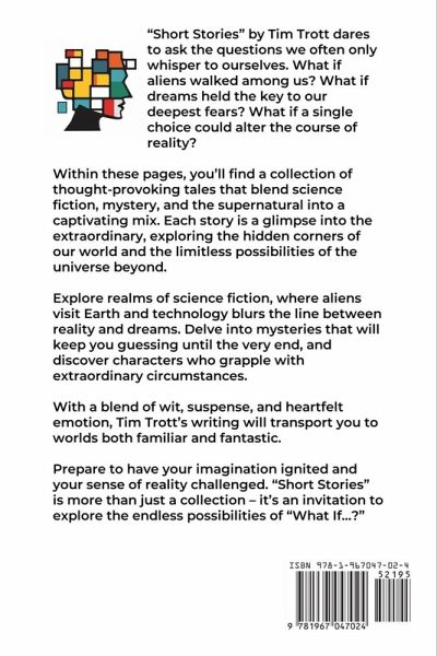 Tim Trott's Short Stories is a compelling mix of suspense, humor, and the extraordinary. In Mind Reader, a detective faces the challenges of hearing people's thoughts. Alien Update follows a journalist unraveling secrets about extraterrestrial life. The Kingdom of Fools offers a satirical glimpse into power gone awry, while Box of Secrets uncovers family mysteries buried in the past. From mind-reading detectives to satirical kingdoms, alien revelations to family secrets, each story brings its own twist. Whether uncovering the hidden truths of human nature or pondering the mysteries of the cosmos, these stories will leave you wondering long after the last page. Each tale offers a fresh perspective, combining imagination and insight to create a collection as thought-provoking as it is entertaining. "Short Stories" by Tim Trott dares to ask the questions we often only whisper to ourselves. What if aliens walked among us? What if dreams held the key to our deepest fears? What if a single choice could alter the course of reality?