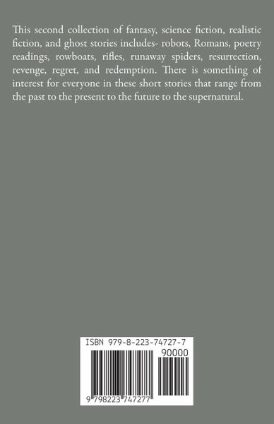 This second collection of fantasy, science fiction, realistic fiction, and ghost stories includes- robots, Romans, poetry readings, rowboats, rifles, runaway spiders, resurrection, revenge, regret, and redemption. There is something of interest for everyone in these short stories that range from the past to the present to the future to the supernatural.