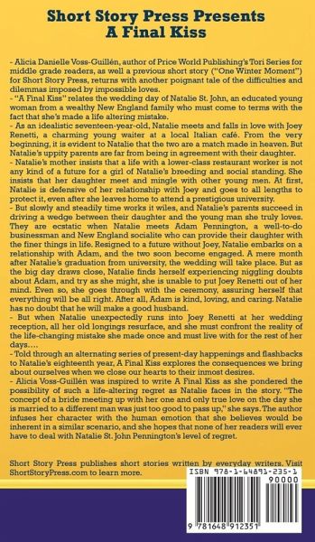 o Alicia Danielle Voss-Guillén, author of Price World Publishing’s Tori Series for middle grade readers, as well a previous short story ("One Winter Moment") for Short Story Press, returns with another poignant tale of the difficulties and dilemmas imposed by impossible loves. o "A Final Kiss" relates the wedding day of Natalie St. John, an educated young woman from a wealthy New England family who must come to terms with the fact that she’s made a life altering mistake. o As an idealistic seventeen-year-old, Natalie meets and falls in love with Joey Renetti, a charming young waiter at a local Italian café. From the very beginning, it is evident to Natalie that the two are a match made in heaven. But Natalie’s uppity parents are far from being in agreement with their daughter. o Natalie’s mother insists that a life with a lower-class restaurant worker is not any kind of a future for a girl of Natalie’s breeding and social standing. She insists that her daughter meet and mingle with other young men. At first, Natalie is defensive of her relationship with Joey and goes to all lengths to protect it, even after she leaves home to attend a prestigious university. o But slowly and steadily time works it wiles, and Natalie’s parents succeed in driving a wedge between their daughter and the young man she truly loves. They are ecstatic when Natalie meets Adam Pennington, a well-to-do businessman and New England socialite who can provide their daughter with the finer things in life. Resigned to a future without Joey, Natalie embarks on a relationship with Adam, and the two soon become engaged. A mere month after Natalie’s graduation from university, the wedding will take place. But as the big day draws close, Natalie finds herself experiencing niggling doubts about Adam, and try as she might, she is unable to put Joey Renetti out of her mind. Even so, she goes through with the ceremony, assuring herself that everything will be all right. After all, Adam is kind, loving, and caring. Natalie has no doubt that he will make a good husband. o But when Natalie unexpectedly runs into Joey Renetti at her wedding reception, all her old longings resurface, and she must confront the reality of the life-changing mistake she made once and must live with for the rest of her days…. o Told through an alternating series of present-day happenings and flashbacks to Natalie’s eighteenth year, A Final Kiss explores the consequences we bring about ourselves when we close our hearts to their inmost desires. o Alicia Voss-Guillén was inspired to write A Final Kiss as she pondered the possibility of such a life-altering regret as Natalie faces in the story. "The concept of a bride meeting up with her one and only true love on the day she is married to a different man was just too good to pass up," she says. The author infuses her character with the human emotion that she believes would be inherent in a similar scenario, and she hopes that none of her readers will ever have to deal with Natalie St. John Pennington’s level of regret. Short Story Press publishes short stories written by everyday writers.