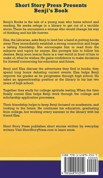 Benji's Books is the tale of a young man who hates school and reading. He seeks refuge in a library to get out of a terrible storm. There he encounters a woman who would change his way of thinking and his life forever. Elsa, the Librarian, asks Benji to lend her a hand in putting books away. They immediately establish a strong connection and forge a lasting friendship. She encourages him to read from the subjects and topics he enjoys. She prompts him to follow his desires. Benji soon learns there is a vast world in front of him to make of, what he wishes. He gains confidence to make decisions for himself concerning his education and future. Benji and Elsa discuss the adventures they find in books, they spend long hours debating current events. Elsa helps Benji improve his grades as he progresses through high school. He takes an apprenticeship position at the library in his last two years of high school. Together they study for college aptitude testing. When the time finally comes Elsa helps Benji work through the college and scholarship application processes. Their friendship helps to keep Benji focused on academics, and looking to the future. He continues his education, graduating from college, but working every summer in the library with his friend Elsa. Short Story Press publishes short stories written by everyday writers.